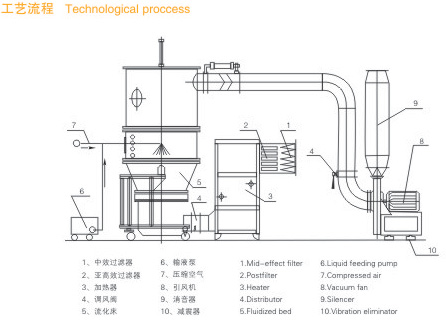 物料粉末粒子,在原料容器(流化床)中呈環形流化狀態,受到經過凈化后的加熱空氣預熱和混合,將粘合劑溶液霧化噴入,使若干粒子聚集成含有粘合劑的團粒,由于熱空氣對物料的不斷干燥,使團粒中水分蒸發,粘合劑凝固,此過程不斷重復進行,形成理想的、均勻的多微孔球狀顆粒。